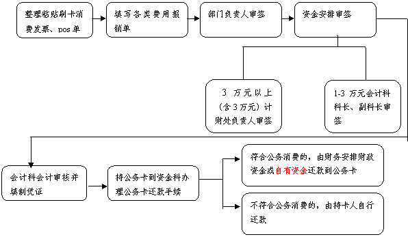 使用公务卡先透支刷卡消费,在规定的期限内按照现行财务制度审核后报帐还款的结算方式。具体流程如下图: